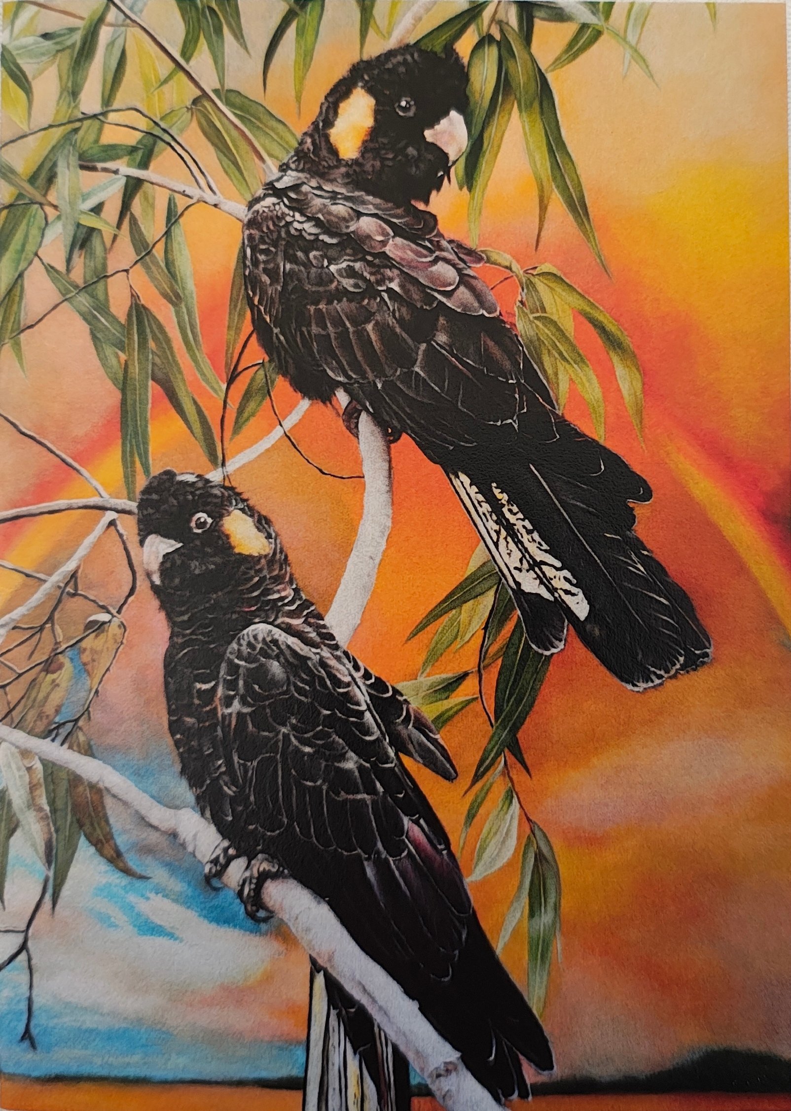 Capture the serene beauty of Australia's wildlife with the "Golden Hour Companions" Greeting Card. Perfect for any occasion, this card showcases a striking painting of Yellow Tailed black cockatoos set against a breathtaking sunset.