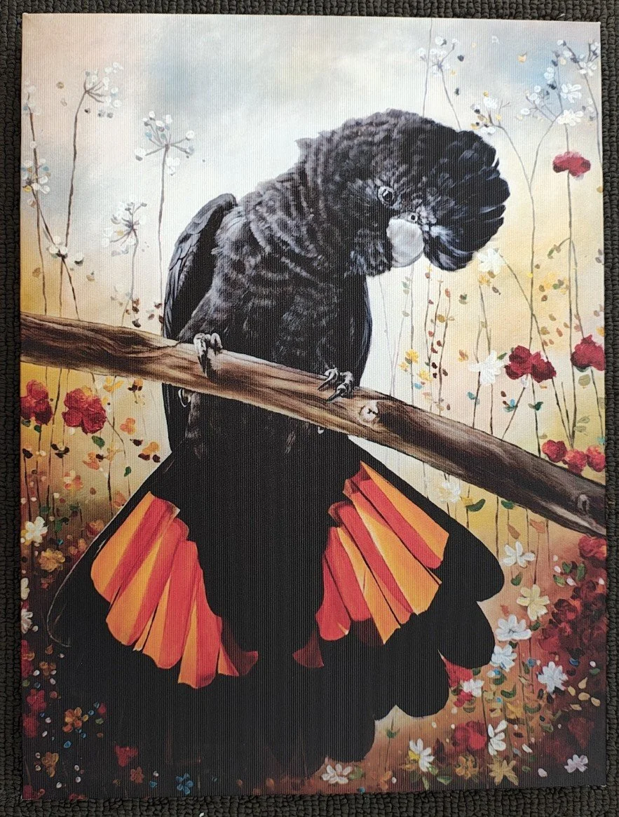 Crimson Tail and Golden Blooms captures the striking beauty of the Red-tailed Black Cockatoo, its powerful form contrasted against a backdrop of radiant golden blossoms. The rich blacks and deep crimson tail feathers create a dramatic harmony with the warm floral tones, celebrating both strength and delicacy in nature. This 40 x 30 cm stretched canvas print is professionally produced to preserve the depth, colour, and detail of the original acrylic painting. Printed on premium-quality canvas and hand-stretched over a sturdy wooden frame, it arrives ready to hang—bringing a bold and elegant statement piece into your home.