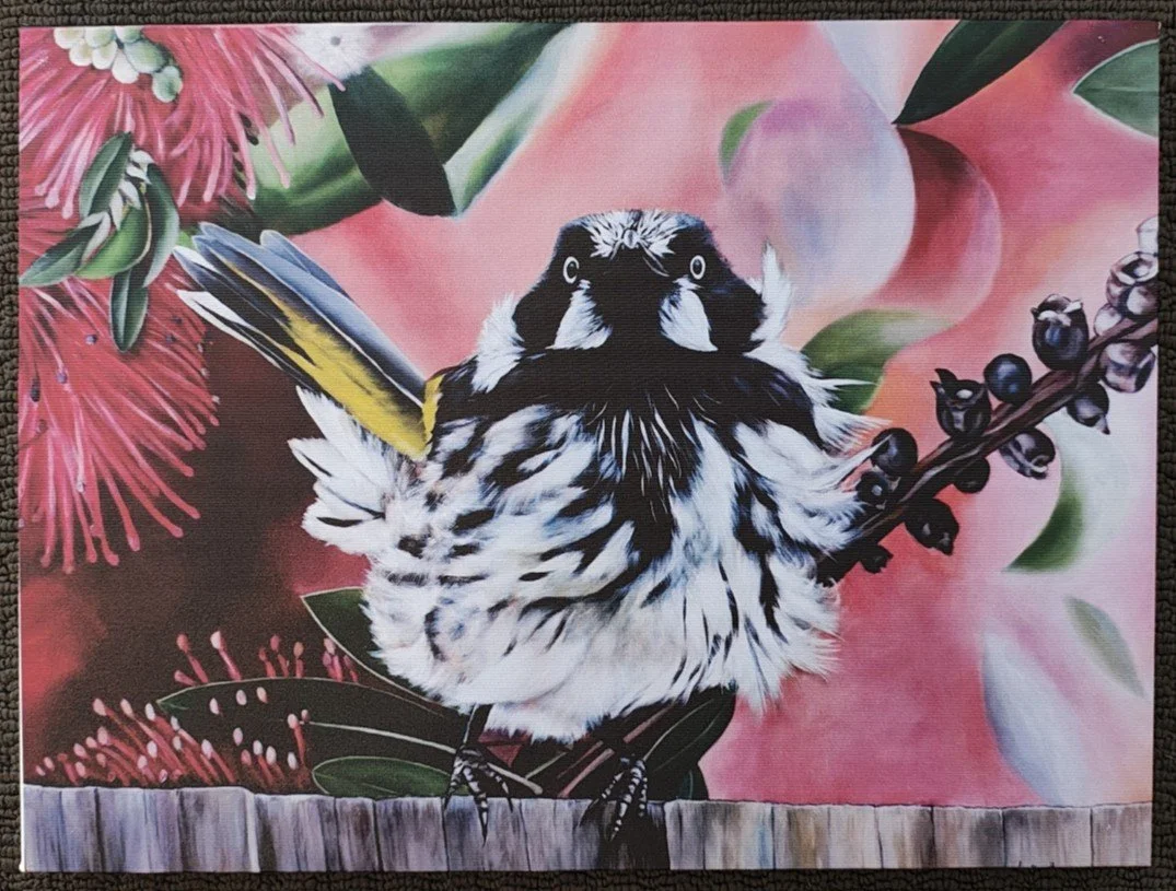 Honeyeater’s Haven captures the lively charm of a honeyeater perched on a fence, pausing in its natural curiosity. The painting highlights the bird’s vibrant plumage and delicate features against a soft, nature-inspired background, celebrating the simple beauty of everyday moments in the Australian bush. This 40 x 30 cm stretched canvas print is professionally produced to preserve the colour, detail, and texture of the original acrylic painting.